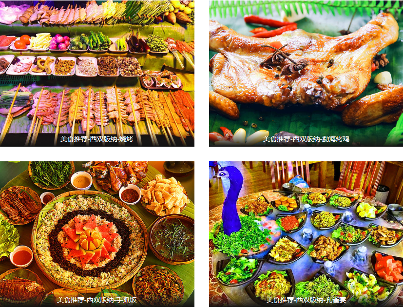 西双版纳不仅景色闻名,美食更是众多,西双版纳有着著名的美食小吃和烧烤,泼水粑粑,水腌菜老奶洋芋,香茅草烤鱼,特色竹虫,烤五花肉、猪皮,舂生牛肉、傣味撒撇,特色牛扒乎、傣味菠萝饭、芭蕉花,酸笋牛肉、包烧鱼、柠檬干巴、竹筒饭、柠檬舂鸡脚、柠檬凉鸡、柠檬肉皮、蹄筋;