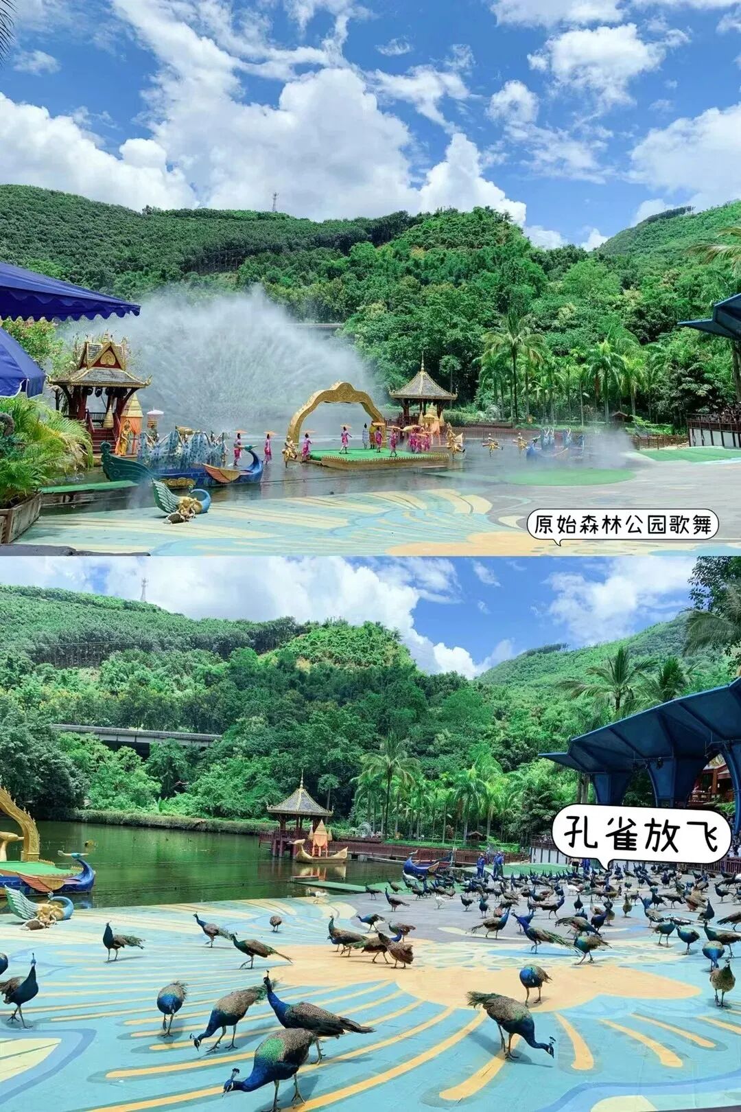 孔雀放飞是西双版纳原始森林公园一道亮丽的风景,三百只孔雀同时从高处飞往舞台,供客人拍照)欣赏西双版纳多民族乐器展览和民族歌舞表演;观赏亚热带雨林中植物风光;漫步热带沟谷雨林;感受神秘的原始森林气氛,别有一番风味。