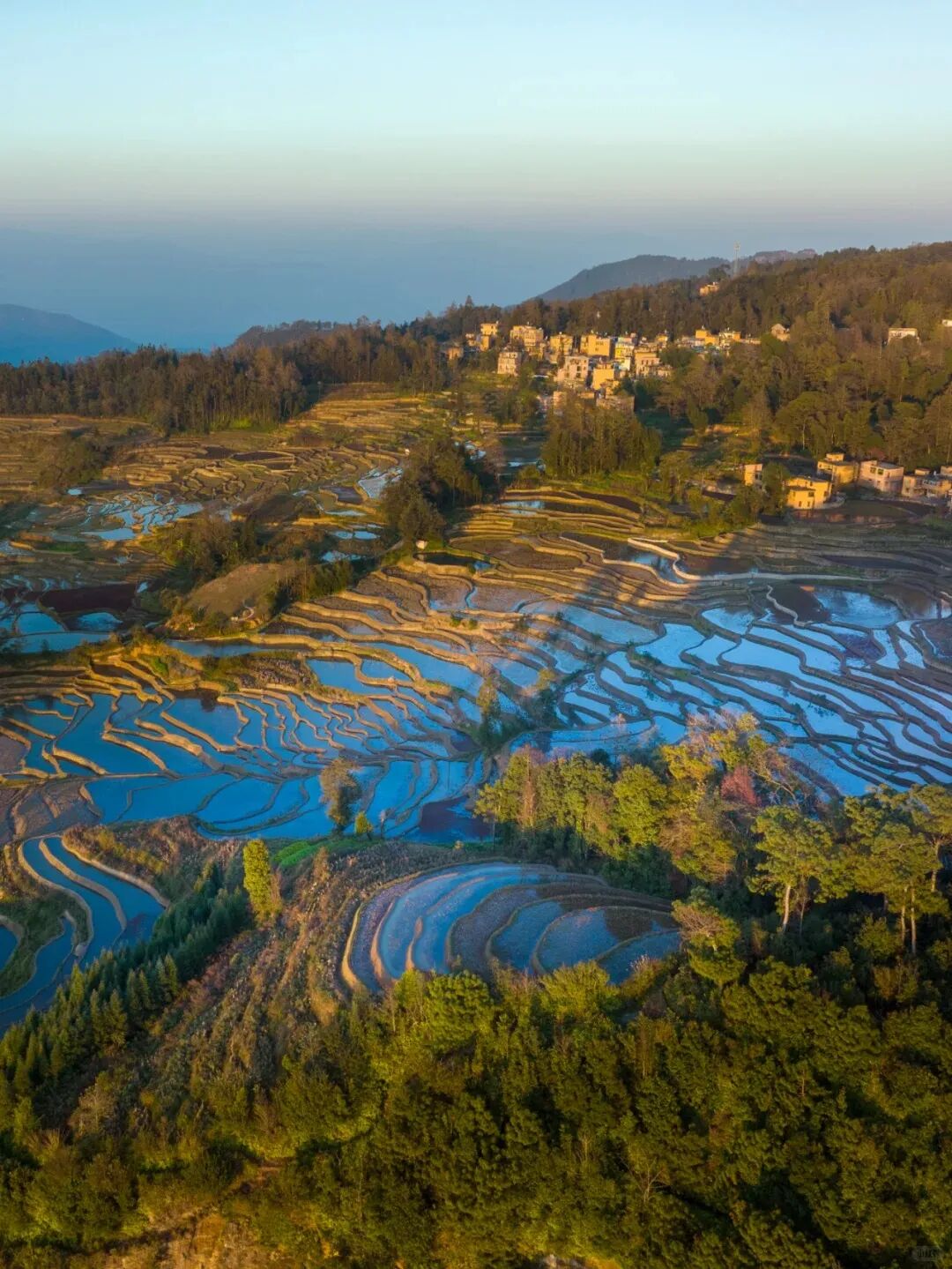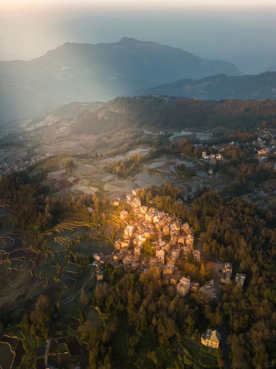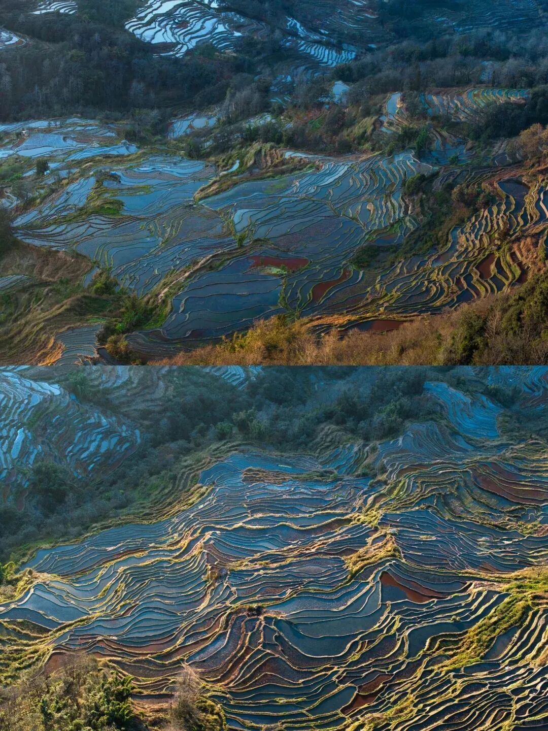 梯田集中连片核心区域主要有坝达、多依树、老虎嘴等 3 个片区。多依树的梯田适合观赏日出,清晨阳光洒在梯田上,金光漫射;坝达梯田有 3700 多级,日落时景色壮观,冬春灌水期可见 “千万颗太阳散落” 的奇观;老虎嘴景区的梯田形似奔腾骏马,气势恢宏,被誉为 “大地雕塑”。
