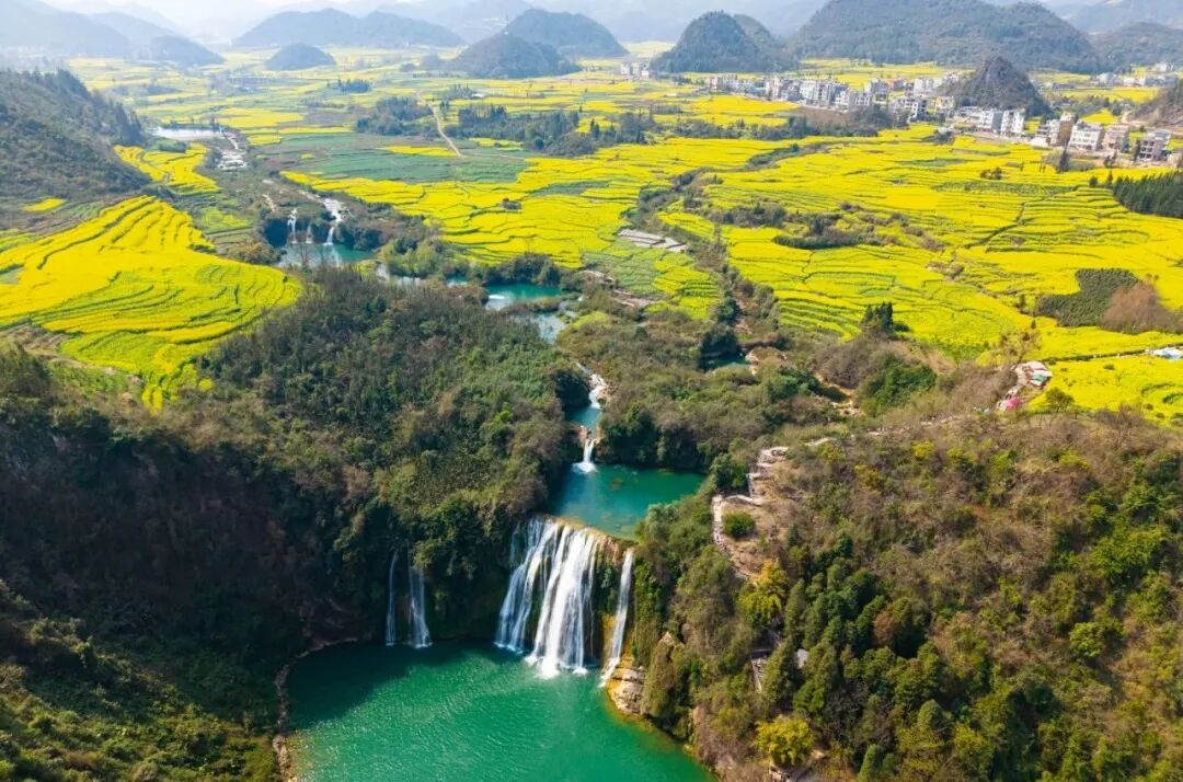 油菜花与喀斯特峰林完美融合,锥状山峰如绿色岛屿点缀金色花海,形成 "抬头是山,低头是花" 的独特景观,被称为 "花上桂林;