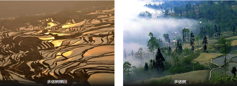 随着太阳的升起,白茫茫的云海逐渐变成粉红色、红色,再转变成粉红色、白色,变幻多端,6000多亩梯田倒映着霞光,田间村寨炊烟渺渺,16000多公顷的原始森林莽莽苍苍,绚丽非常。夏秋的多依树也很有看点,夏的碧绿秋的金黄漫山遍野,只需要一束光,就让翡翠铺满山谷,让金黄铺满大地。