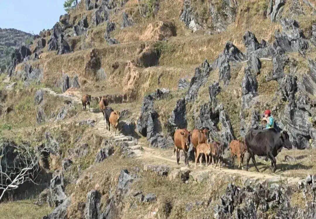 12:30 吃饱喝足,继续出发,喀斯特地貌千奇百怪,时常有牛群,羊群与你擦身而过,广阔的阳石林地带就像一个天然的大牧场,特别的风景点。值得一提的是,这里的石林是目前广东省内发现的最大连片阳石林从林间还隐藏着一