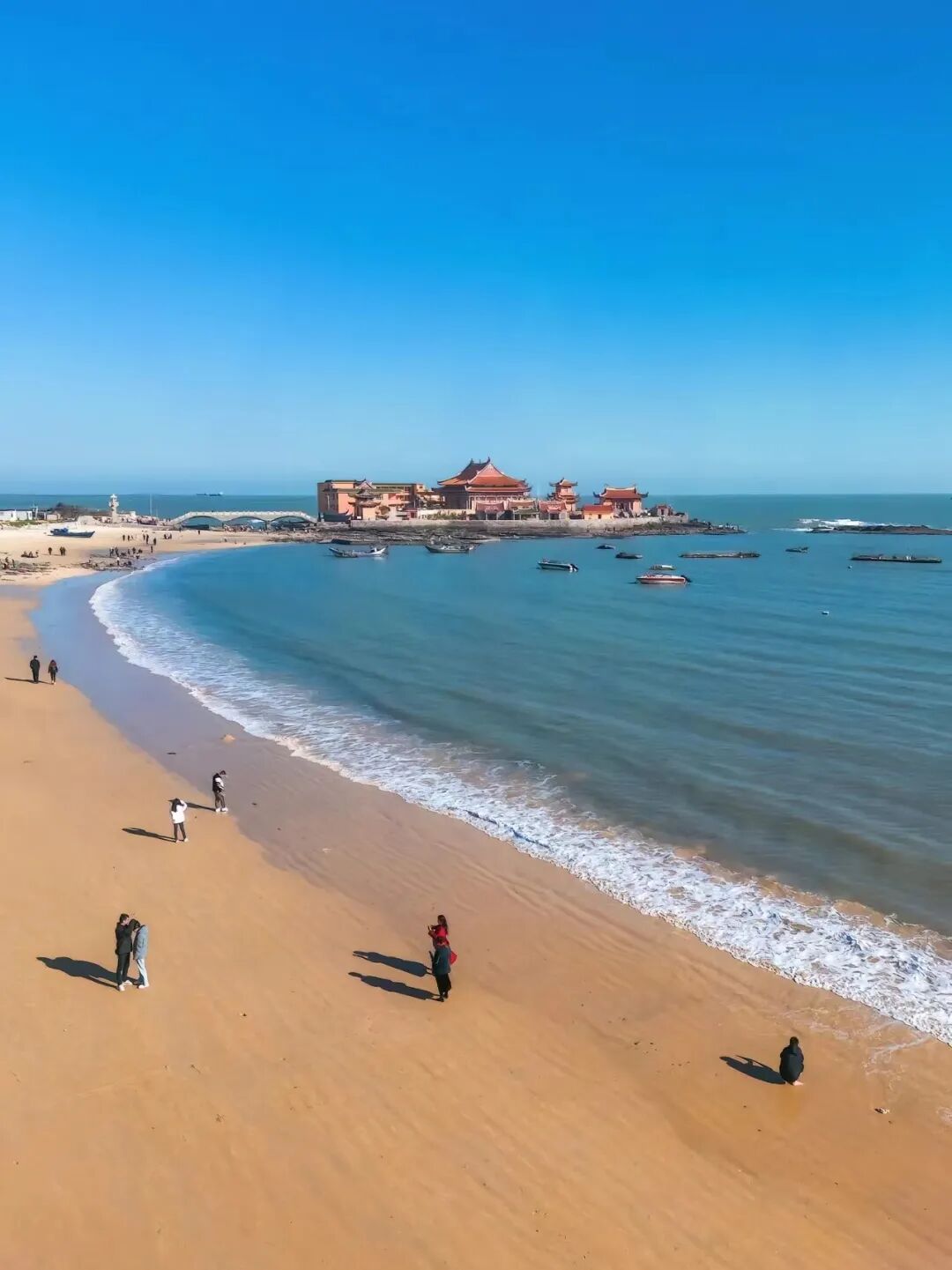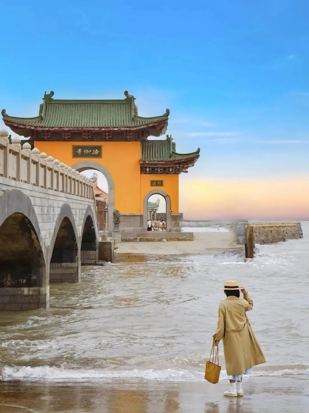 【海天佛国-珞珈寺】全国唯一的海上寺庙,福建泉州石狮市的黄金海岸,有这么一座寺庙,每当太阳浮出海平面时,它就会披上金光。洛迦寺矗立于海边礁石之上,时不时会有海浪拍打礁石溅起层层浪花。洛迦寺在海滩的最东头,每当涨潮的时候就会淹没连接的沙滩,为了方便前往,建了一座金桥连接寺庙和海岸。