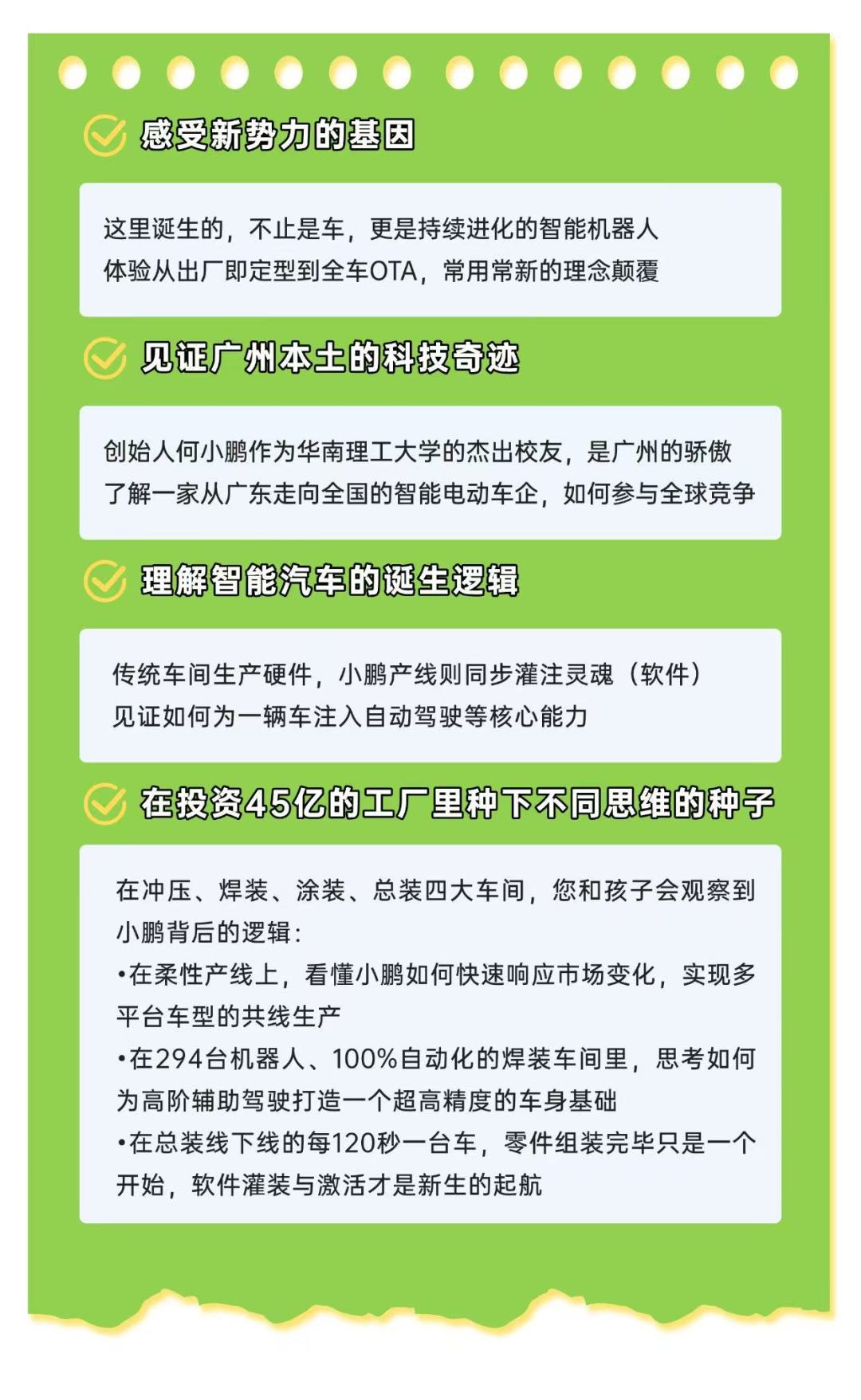 看底盘、电池、座椅、轮胎如何被精准地安装到车身上。在这里,你和孩子可以亲眼见证平均每120秒,就有一台崭新的小鹏汽车下线!