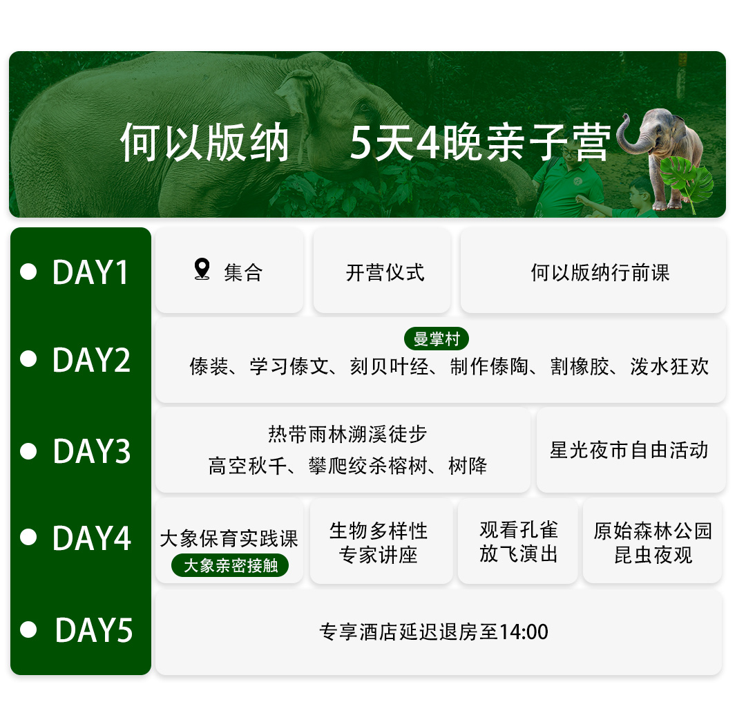 注:根据野象谷保护区当日安排来确认大象保育实践课内容:【大象博物馆+雨林牧象或大象营养师】+大象亲密接触