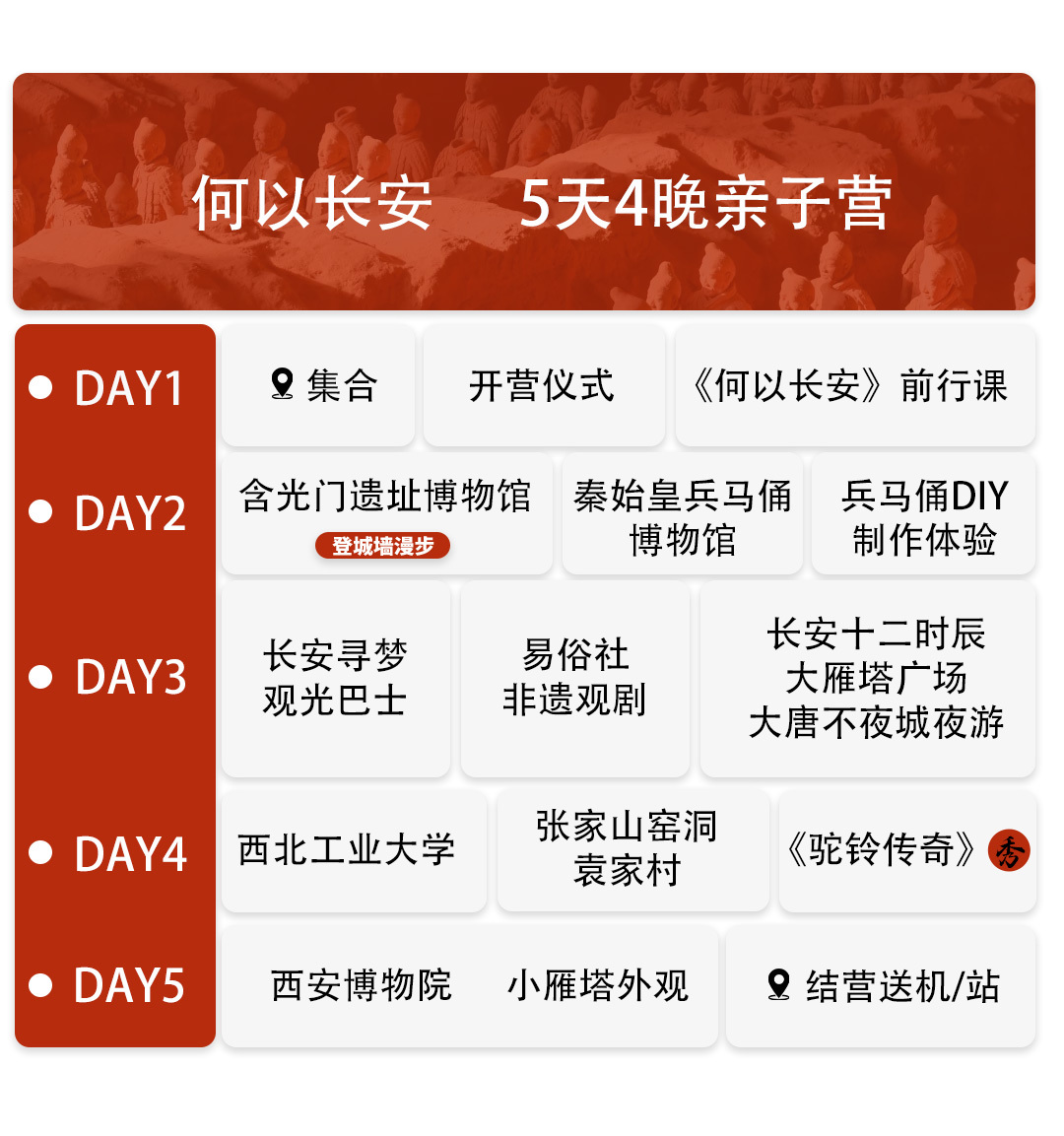7.活动体验:兵马俑DIY制作体验、长安寻梦观光巴士、易俗社非遗观剧、西北工业大学、张家山窑洞体验;