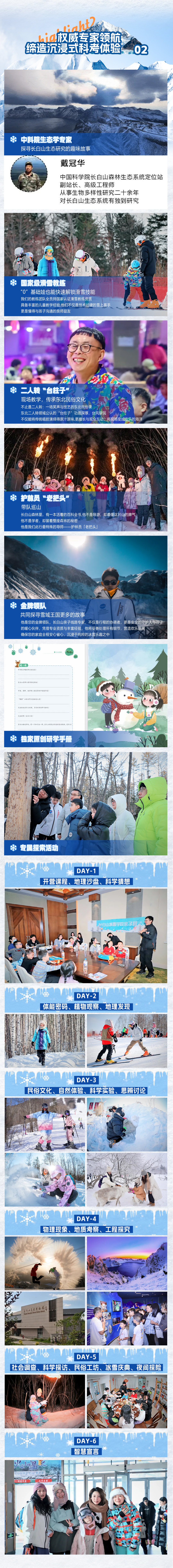 6. 服务:游学期间的司机、全程一名资深领队(0自费0购物)、全程一名专业摄影师(含照片直播)、滑雪教练费(1:4)、长白山自然博物馆讲解员一位、中科院专家一位、二人转演员两位、各体验活动驻点老师等