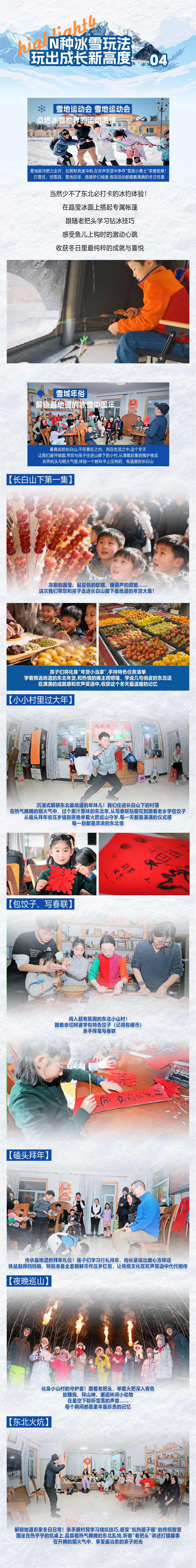 下午:专属村落体验东北过年文化;挖雪洞、摆糖果、打雪仗、上炕头了解东北过年习俗、亲子拉爬犁接力赛、雪地拔河、冰钓、雪地足球赛、包饺子、写春联、剪窗花、铁盆拜年领红包等