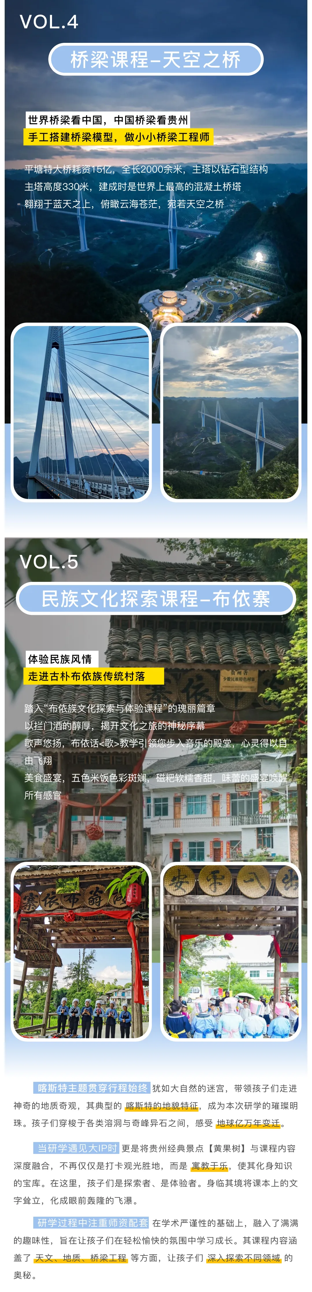 “世界桥梁看中国,中国桥梁看贵州”,贵州桥梁几乎包揽了当今世界上的全部桥型,一座座的大桥像是一把把打开大山禁锢的钥匙,也更是孩子们了解桥梁工程科技和研学大国重器的重要课程载体。为此,我们安排了特色活动【搭建桥梁模型】课程,小朋友们将化身小小工程师,通过一系列生动有趣的学习和实践环节,深入了解桥梁的奥秘。这是一次从书本走向生活,从课堂走向社会的研学活动,通过了解桥梁科技的伟大成就,激励小朋友们投身科技创新,树立成为大国工匠的远大目标,增强对于“中国力量”的自豪感。