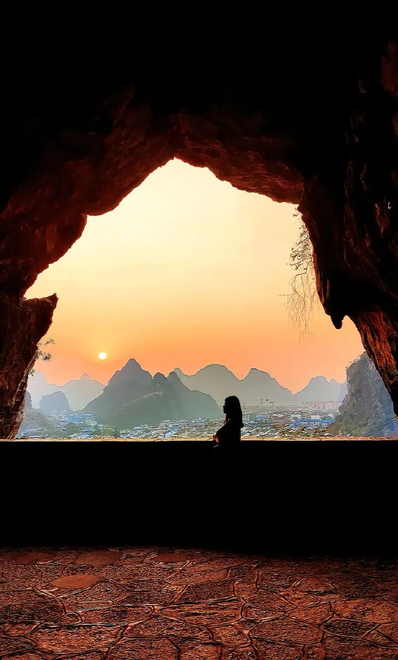 来叠彩必来仙鹤洞,洞穴日落将城区和日落完美结合,人像剪影超唯美