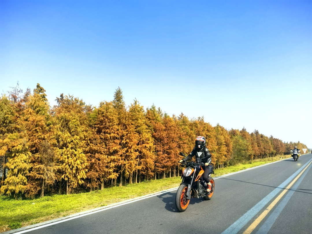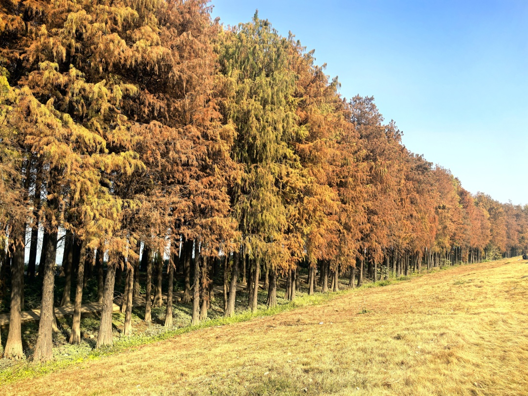 顺德的冬天把浪漫都藏在了乌洲水闸的落羽杉里,几公里的红杉沿江水铺展,焦糖色、橙红色交织,倒映在粼粼波光里,走进去就像闯进莫奈的调色盘。