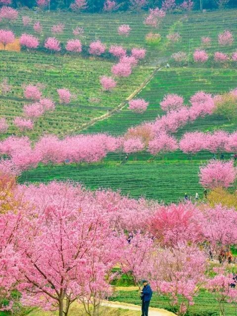 万株樱花在千亩茶田间恣意绽放