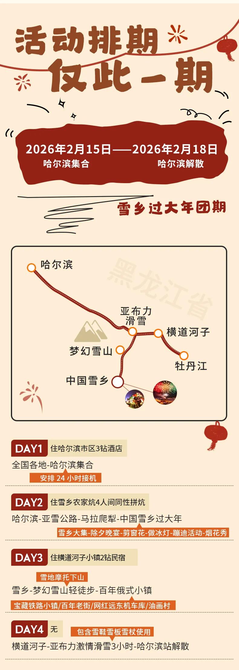 4、雪乡过年的雪地蹦迪、花车巡游活动、春节烟花等活动行程以景区开放情况为准,如未举办则取消无退费