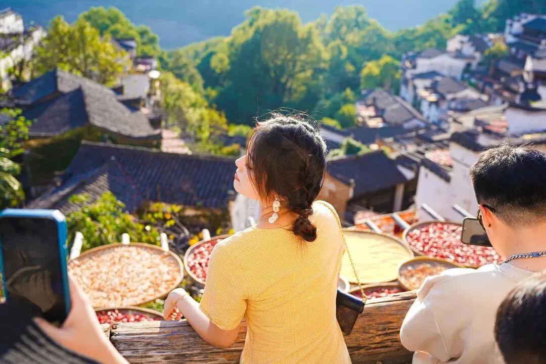早上:08:00-08:30 各酒店接客人后出发,后车赴婺源,游“赏花圣地”、“全球十大最美梯田”、“世界级古村样板”、“美术、摄影及影视创作基地”——【篁岭】,景区独特的“晒秋”景观符号成功入选“最美中国符号”。篁岭属典型山居村落,民居围绕水口呈扇形梯状错落排布。篁岭因“晒秋”、闻名遐迩,落“天街”似玉带将精典古建串接,徽式商铺林立,前店后坊,一幅流动的缩写版“清明上河图”。 周边千亩梯田簇拥,四季花海展示惊艳的“大地艺术”。 独特的民俗文化体验带您走过索桥、滑过溜索、攀上高空热气球,俯瞰独特的晒秋奇观;参天古树浓荫匝地,错落点缀在层叠的梯田、蜿蜒的青石板古道和曲折的清溪之间。三角梅、玫瑰等花海景观变幻,穿行在隐约可见的廊桥亭阁和粉墙黛瓦的民居村落中,远离都市喧嚣。